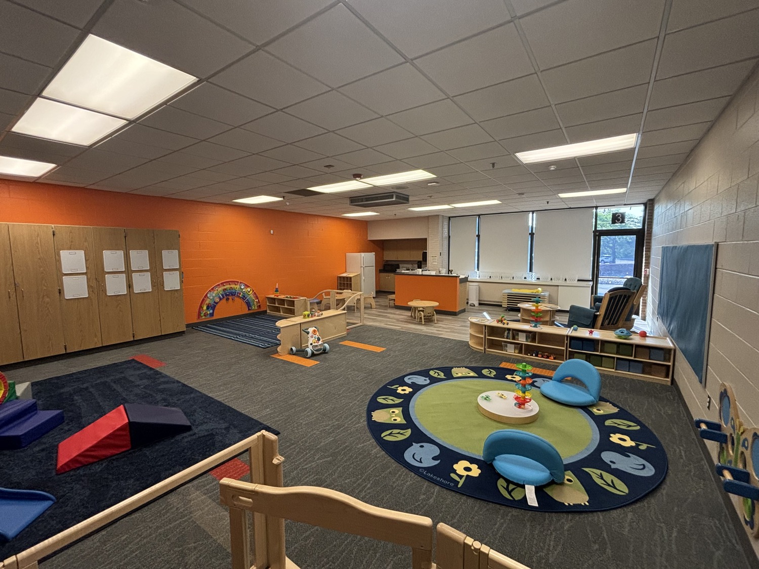 The project also features a unique connector, referred to as “The Bridge,” that connects the existing building to the new addition, with a wall “playground” within a 20-foot clerestory. The corridors are lined with colorful finishes, including a special patterned carpet designed by the interior designer custom to Temple Israel.